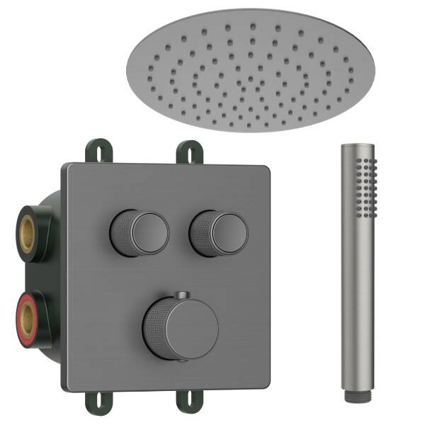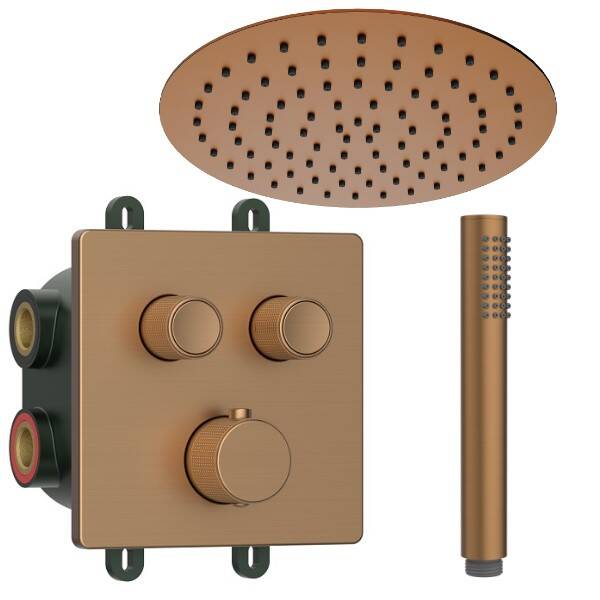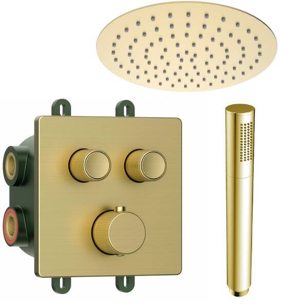 De Dolly inbouw regendoucheset is een complete luxe set die jouw badkamer een strakke en moderne uitstraling geeft. De set bestaat uit een thermostatische inbouwkraan met knoppen en achterplaat, een hoofddouche naar keuze en een handdouche. Dankzij de PVD-coating is de afwerking extreem kras- en kleurvast en blijft de set jarenlang mooi.