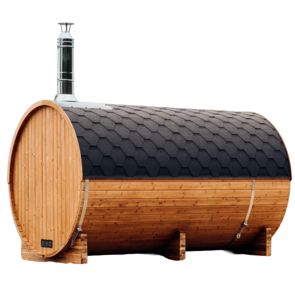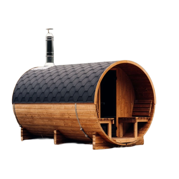 De Aurora Sauna Barrel met buitenzit combineert luxe wellness met extra comfort. Naast de ruime sauna beschikt dit model over een stijlvol zitgedeelte aan de voorzijde, ideaal om even te ontspannen of af te koelen tussen saunasessies door.