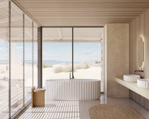 Transformeer je badkamer in een serene oase met de nieuwe Catching Waves Solid Surface badkuip. De organische rondingen en zachte lijnen creëren een rustgevende sfeer.