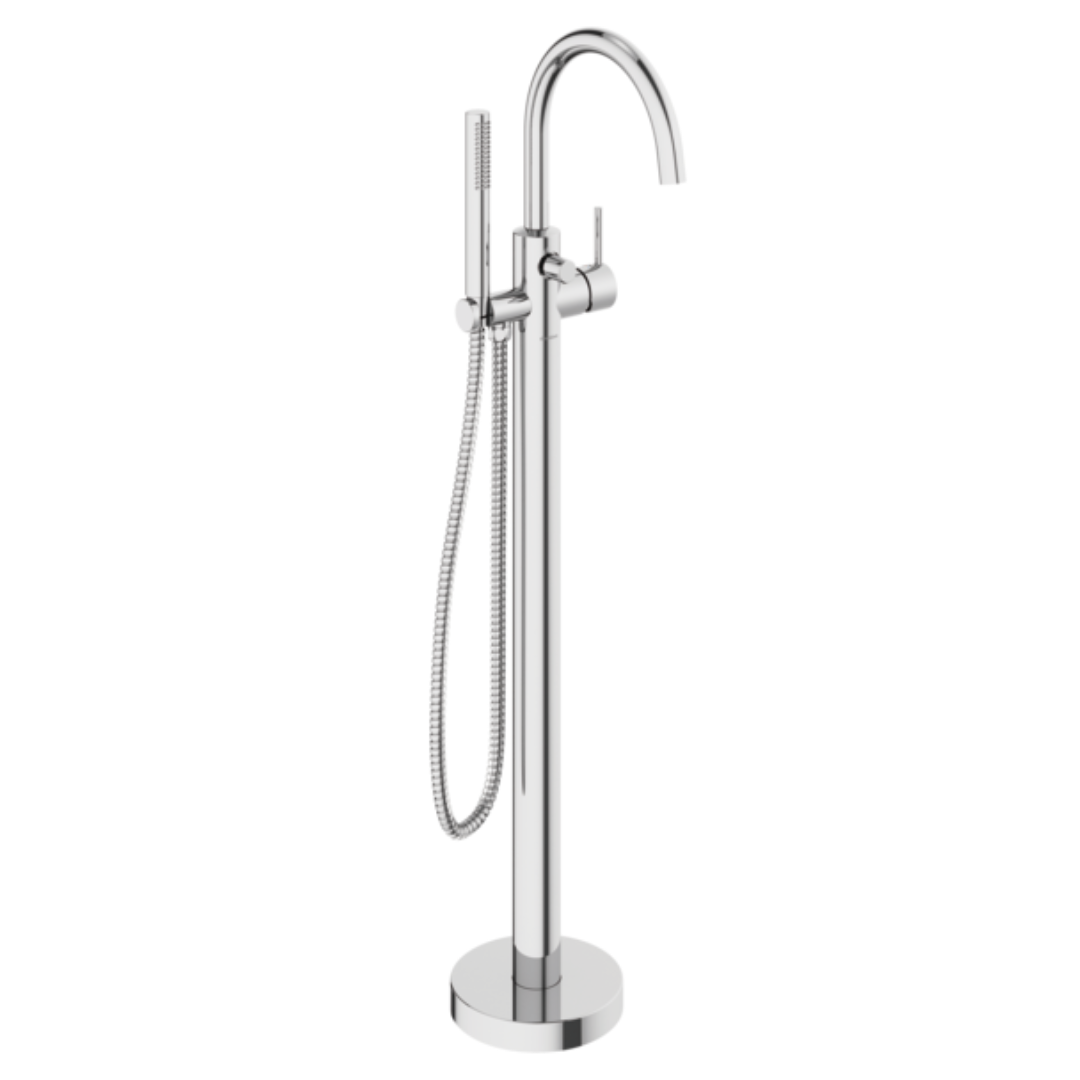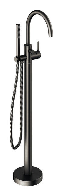 Vrijstaande badmengkraan met geïntegreerde inbouwunit en complete handdoucheset, geschikt voor vloerinstallatie bij een losstaand bad.