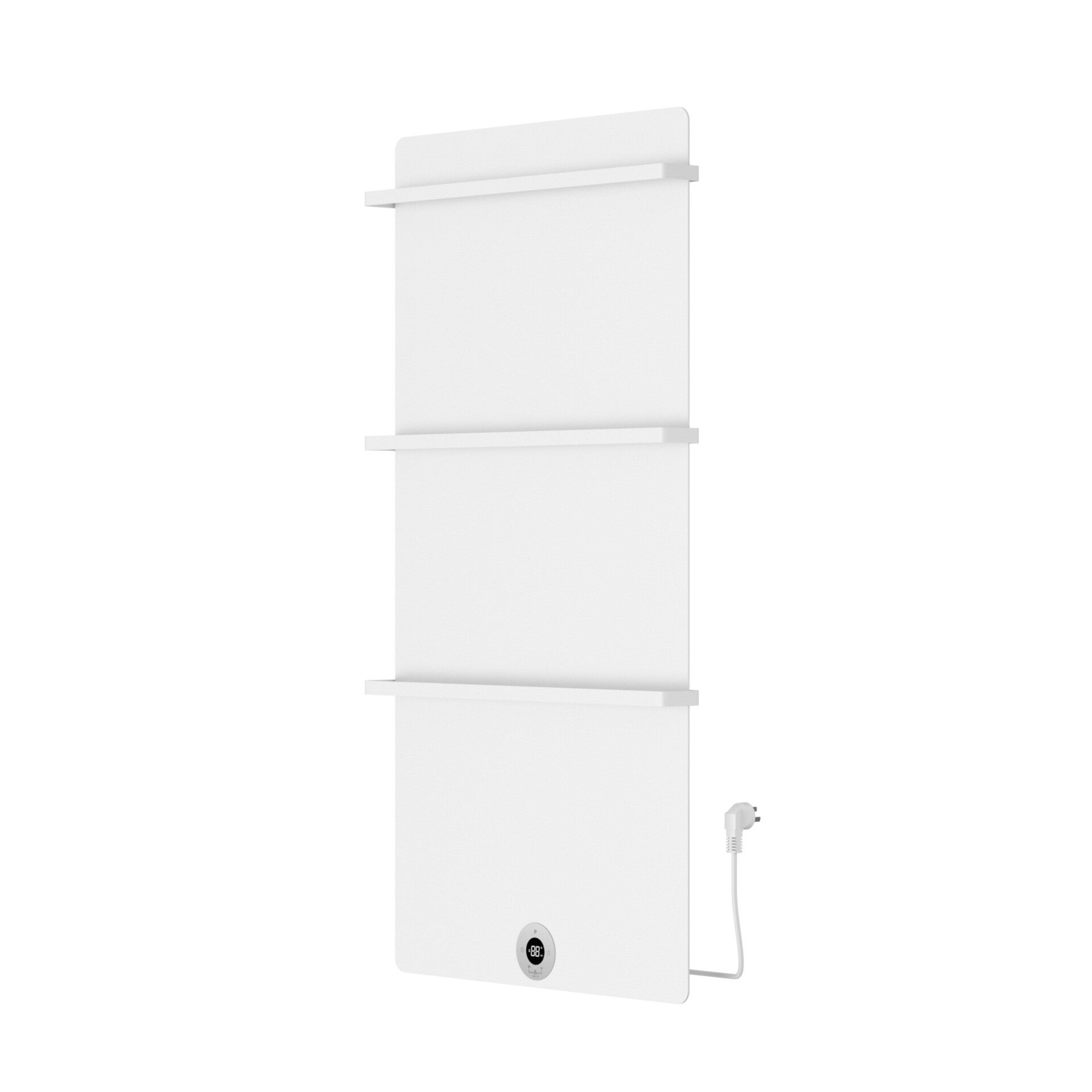 Elektrische radiator voor wandmontage, geschikt voor badkamer en overige ruimtes, met digitale thermostaat en handdoekbeugels.